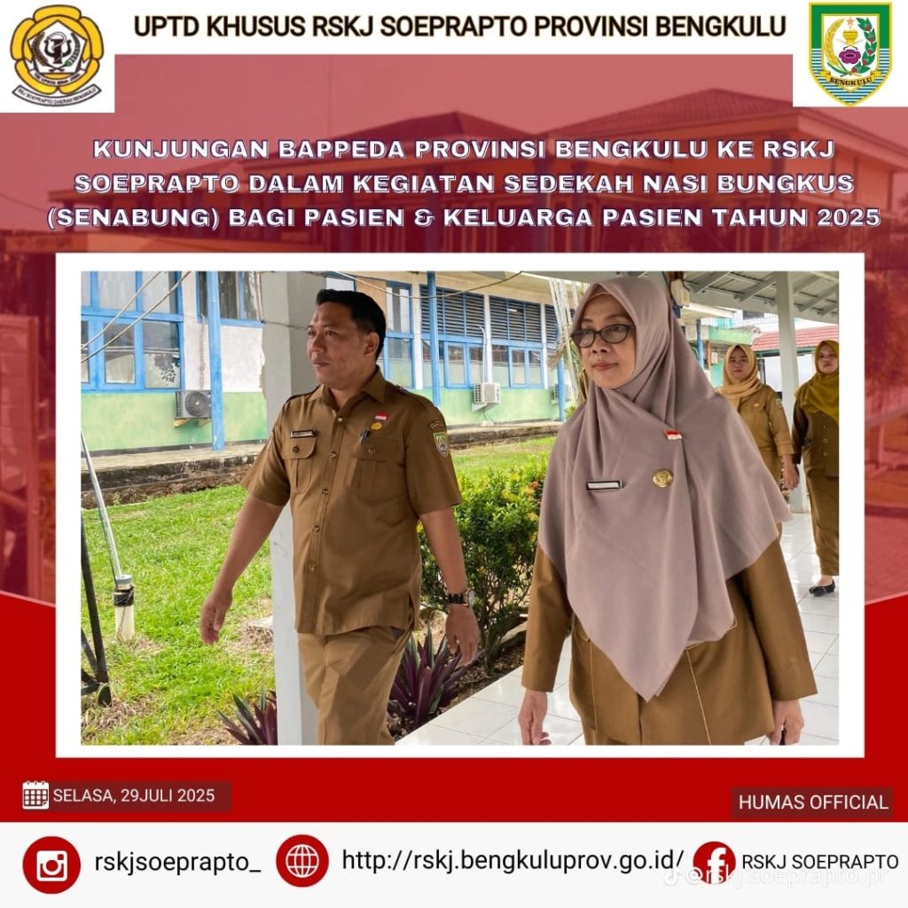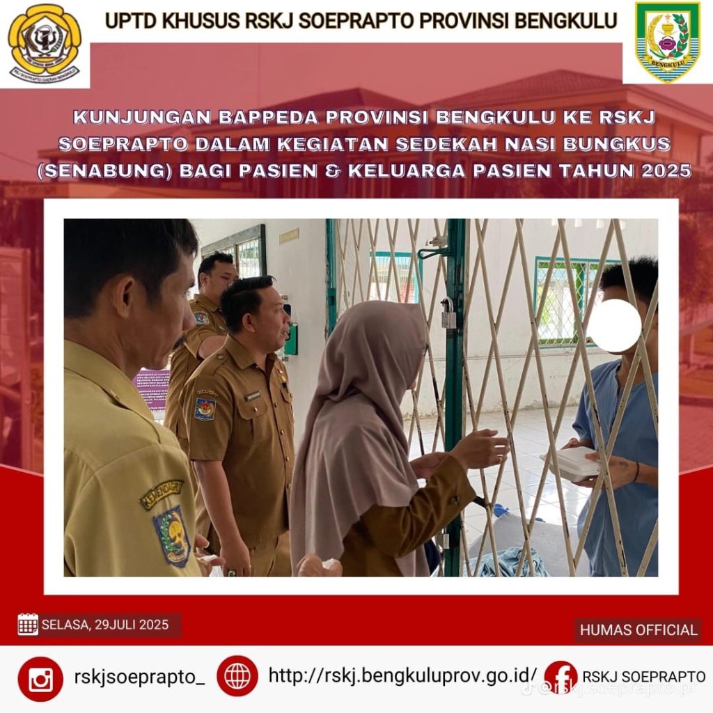 Kegiatan ini merupakan bagian dari program sosial rutin yang diinisiasi oleh Gubernur Provinsi Bengkulu kepada seluruh OPD Provinsi Bengkulu termasuk Dinas BAPPEDA. Sebagai bentuk kepedulian Dinas BAPEPEDA terhadap masyarakat, khususnya para pasien dan pengunjung rumah sakit yang membutuhkan perhatian lebih. Dalam kesempatan ini, tim dari BAPPEDA membagikan ratusan nasi bungkus secara langsung kepada para pasien rawat jalan, keluarga pasien, serta pengunjung yang sedang berada di lingkungan RSKJ Soeprapto.