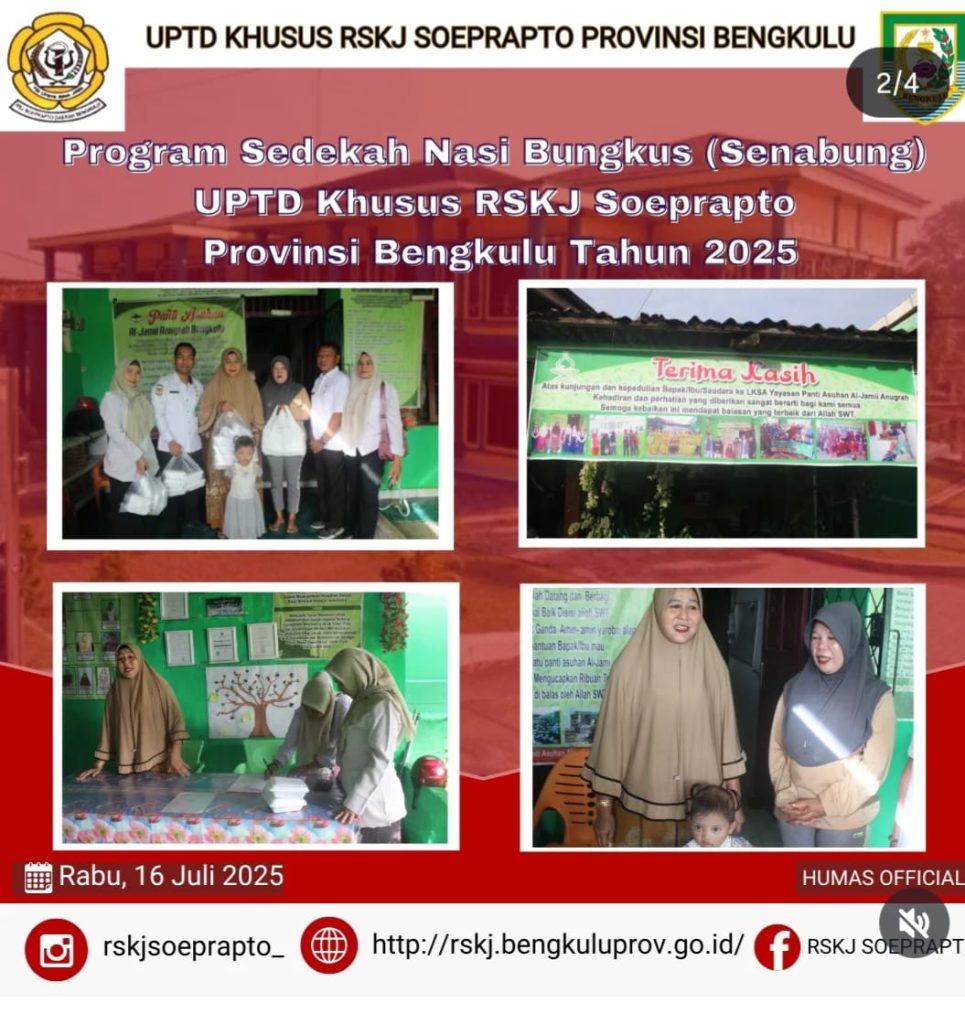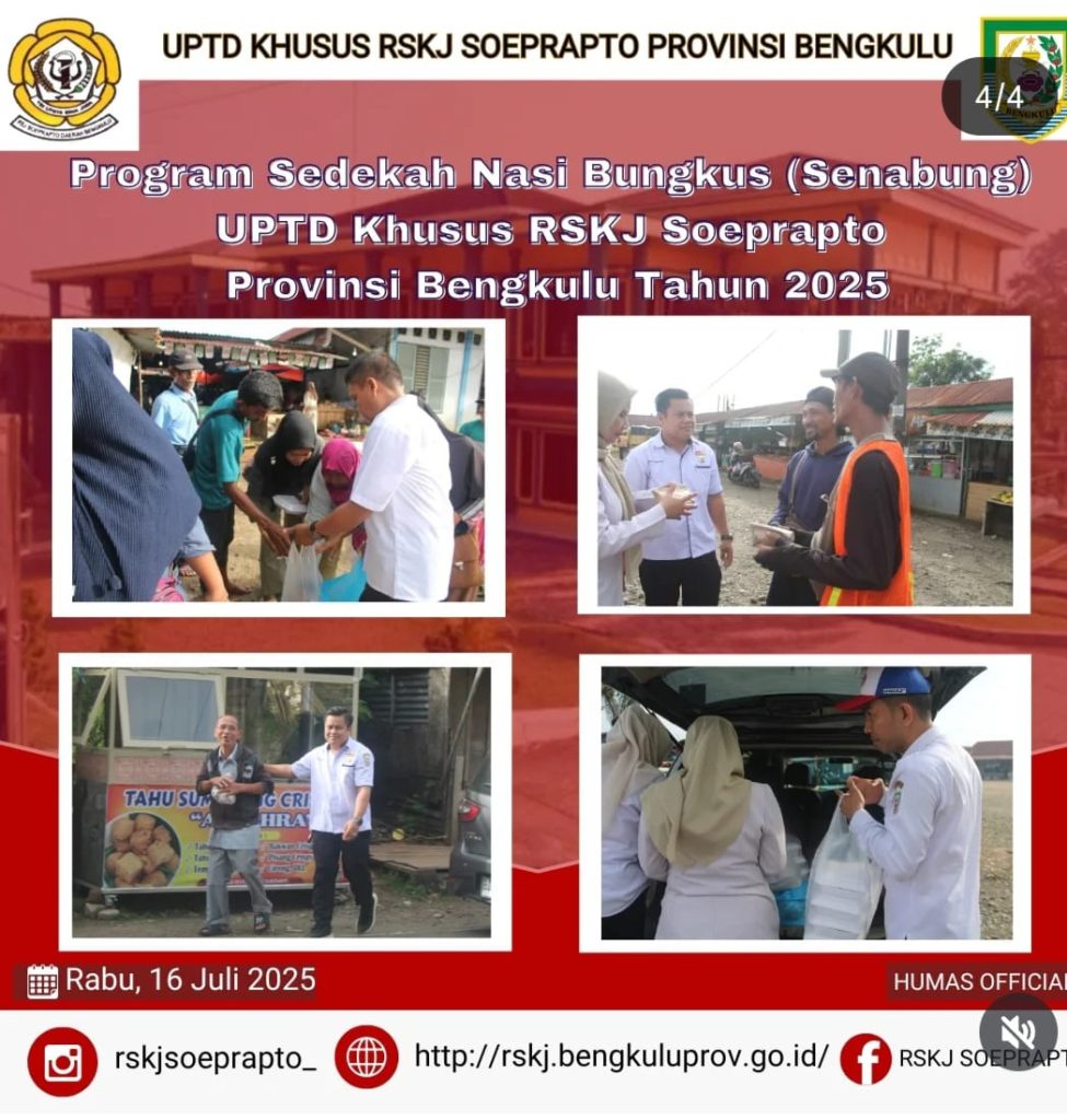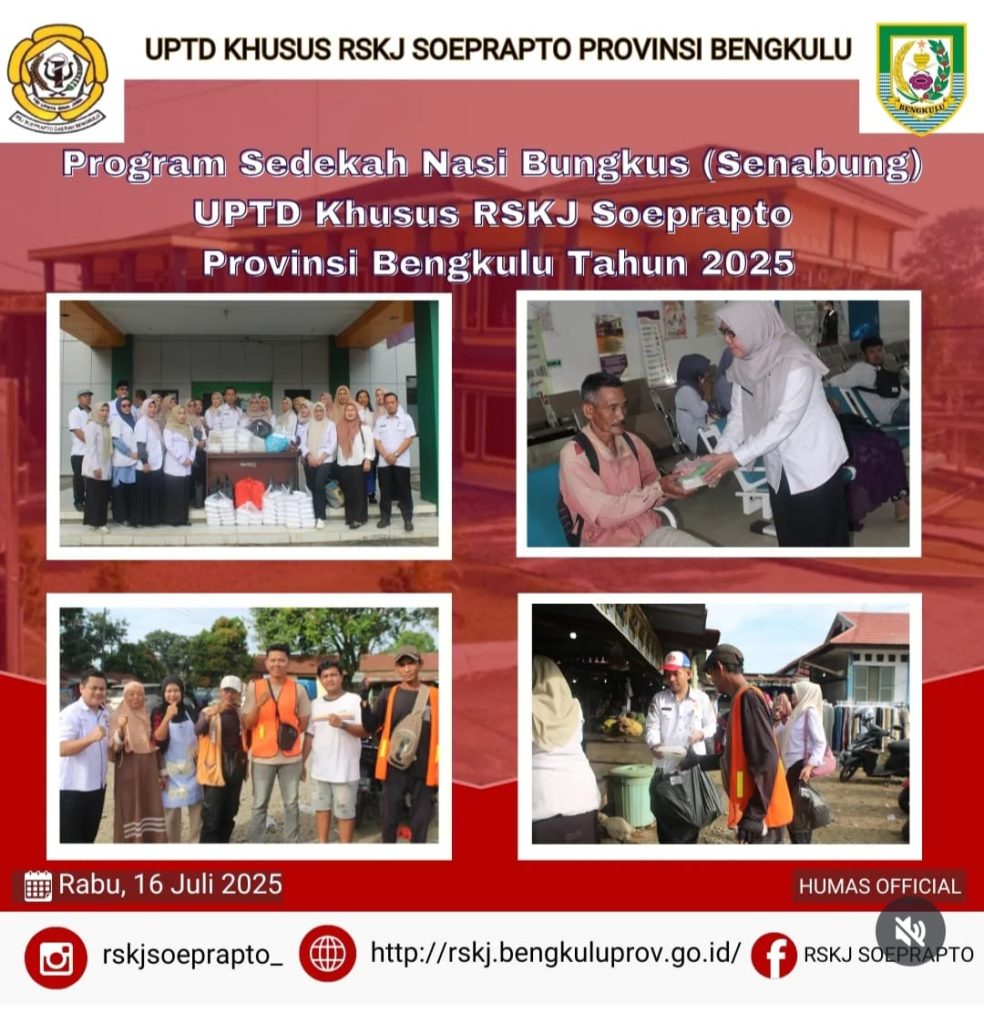 Bengkulu, 21 Juli 2025 — Rumah Sakit Khusus Jiwa (RSKJ) Soeprapto Bengkulu kembali menunjukkan komitmennya terhadap kegiatan sosial dengan melaksanakan program SENABUNG (Sedekah Nasi Bungkus) yang merupakan salah satu inisiatif dari Gubernur Bengkulu sebagai bentuk nyata kepedulian terhadap masyarakat kurang mampu dan lingkungan sekitar.